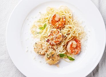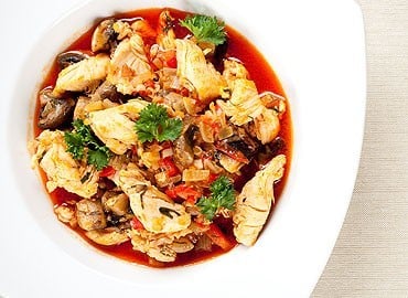 Fried garlicky prawns, fennel, tomatoes, chilli, saffron, fish broth & lemony rocket.